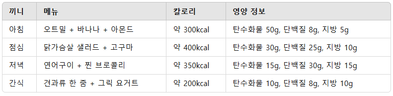- 추천 음식: 닭가슴살, 아보카도, 연어, 견과류, 브로콜리